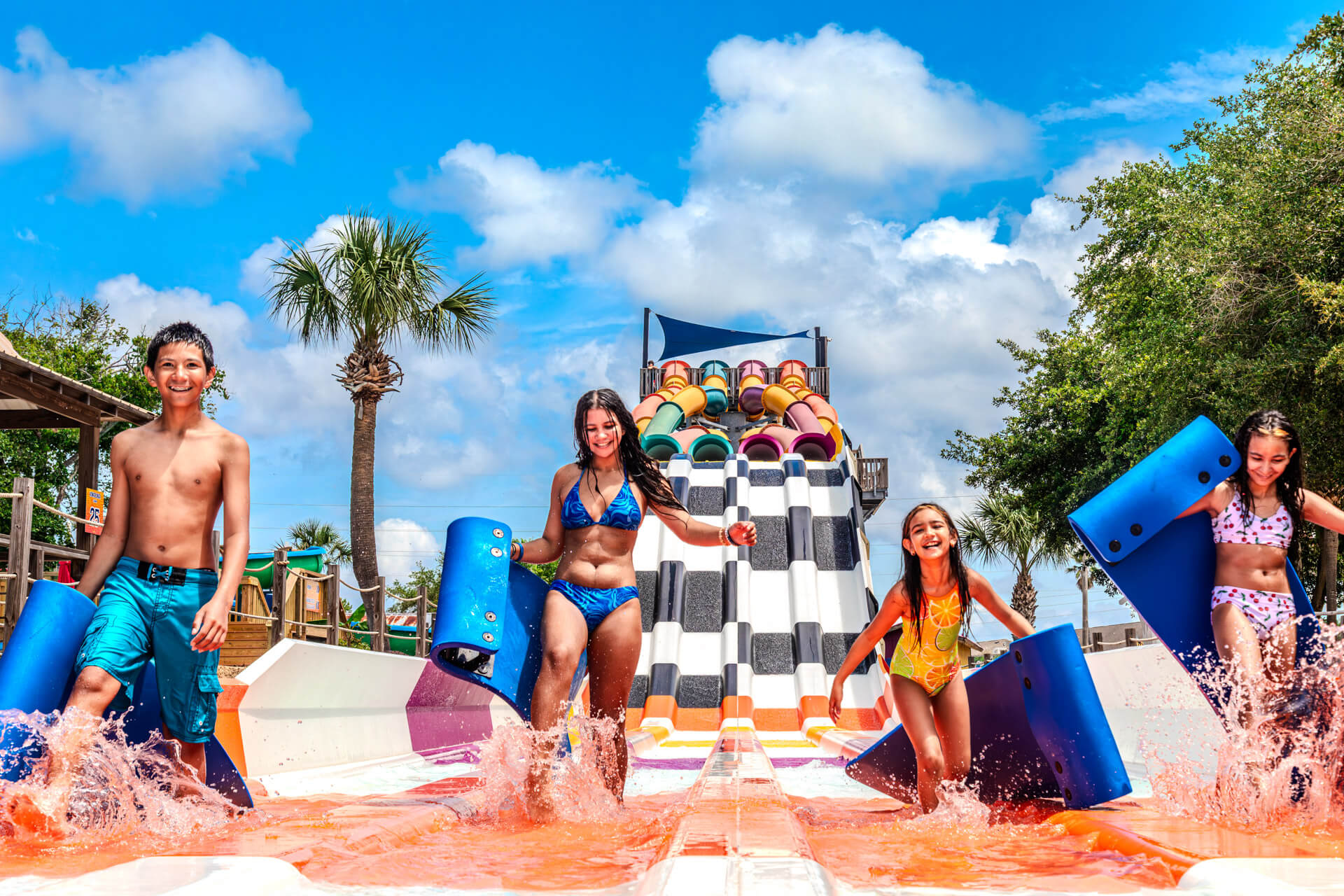 Race your friends down the Kowabunga Racer at Big Kahuna’s Water Park — a multi-lane water slide designed for high-speed competition and serious splash.