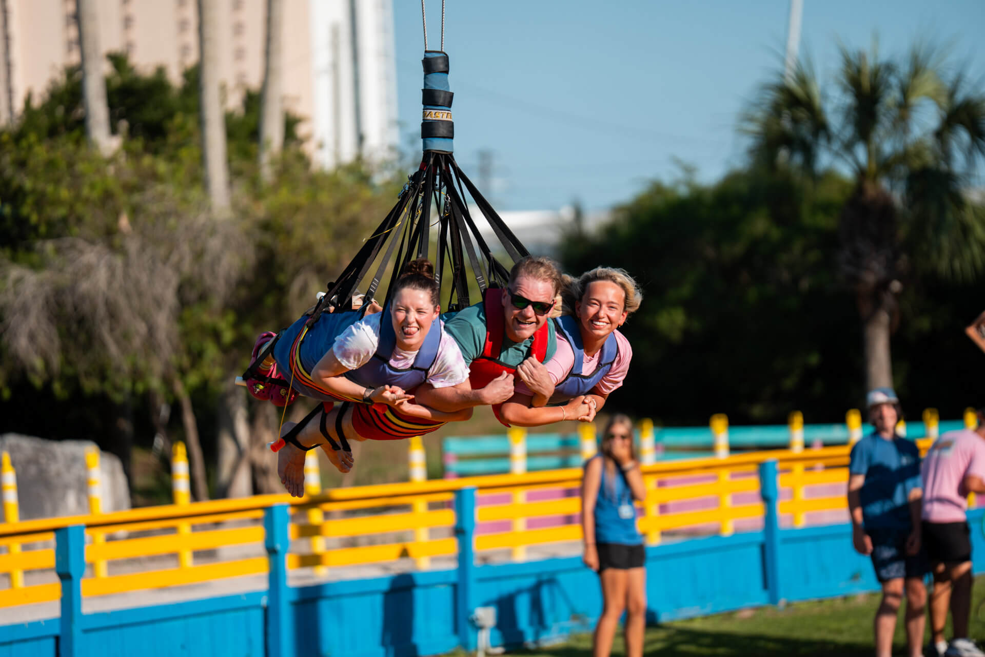Safety is a top priority on the Skycoaster. Riders must be at least 42 inches tall to participate, ensuring that only those who are ready for this high-flying adventure can take part. Additionally, the combined weight of the three riders cannot exceed 800 pounds, which helps maintain the safety and integrity of the ride. Each rider is securely harnessed, providing peace of mind as you enjoy this exhilarating experience.